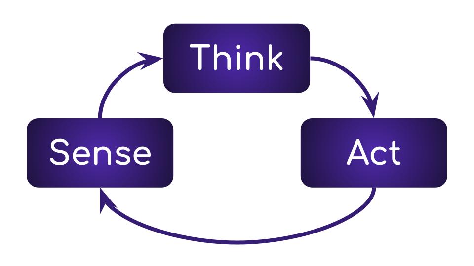 This is the basic architecture of any robotic system. The first step involves “sensing” or perceiving the world. The next step involves “thinking” where the perceived information is used to form a model of the world and possible actions are deduced. This step is followed by “acting” step where actions are performed that will affect the environment or the robot itself. This loop is then repeated.